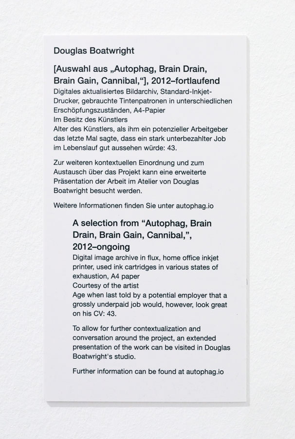 To allow for further contextualization and conversation around the project Autophag, Brain Drain, Brain Gain, Cannibal, beyond its inclusion as part of the Klassenfragen exhibition, an alternate presentation of the work can be visited in Boatwright’s Berlin studio on selected dates and by appointment.